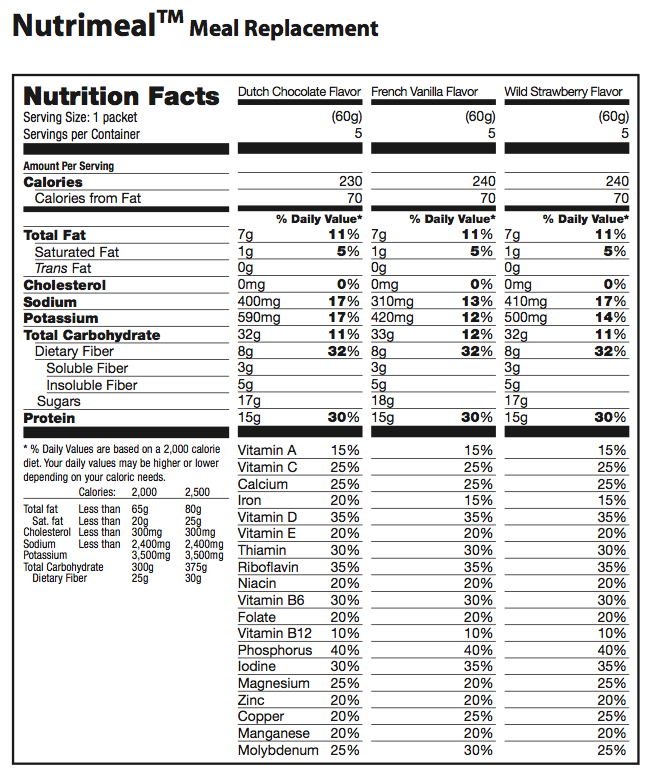 • 15 sobres de porciones individuales Nutrimeal™ (8 de chocolate holandés y 7 de vainilla francesa)—Nutrimeal de USANA está formulado con la proporción correcta de proteínas completas, grasas beneficiosas, fibra e hidratos de carbono de bajo índice glicémico para ayudarle a mantener sus niveles de energía. Esta cremosa y deliciosa malteada lo mantendrá satisfecho al tiempo que reducirá su consumo de calorías.*