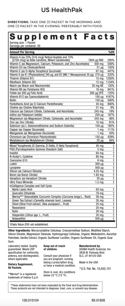 HealthPak is powered by InCelligence, a patented combination of cell-supporting nutrients. By consuming these nutrients in precise amounts, you’ll be prioritizing your health through targeted cell-signaling pathways. *
